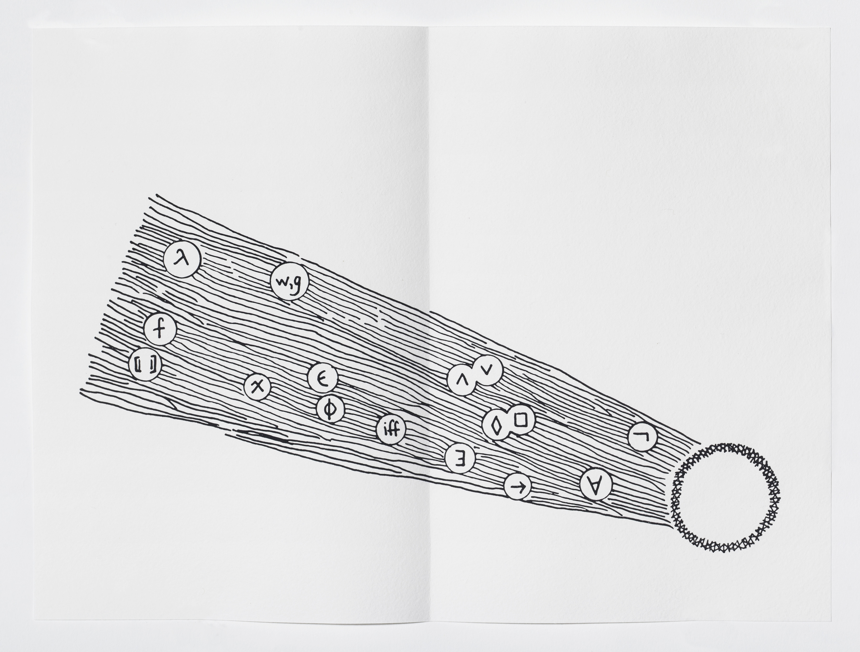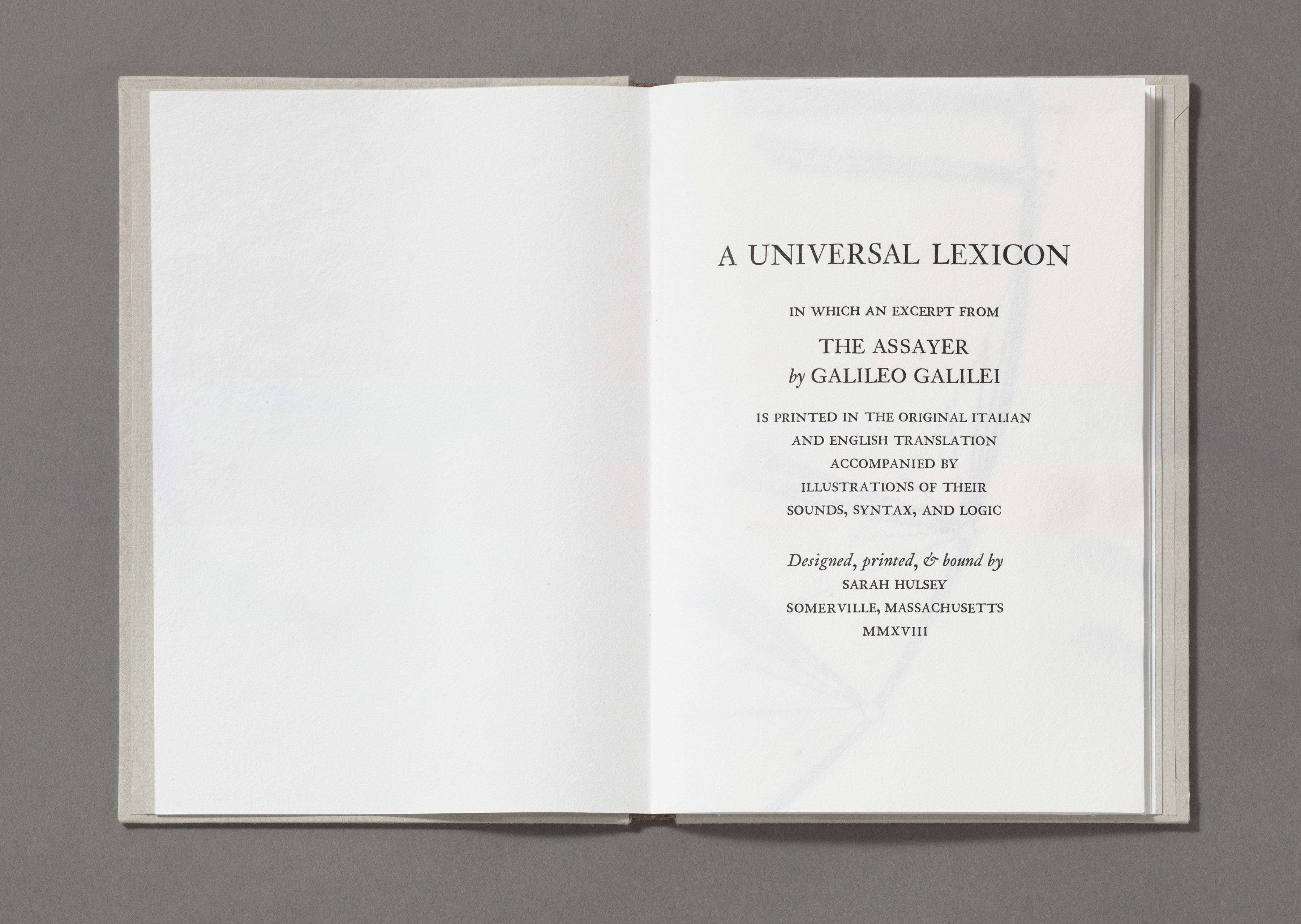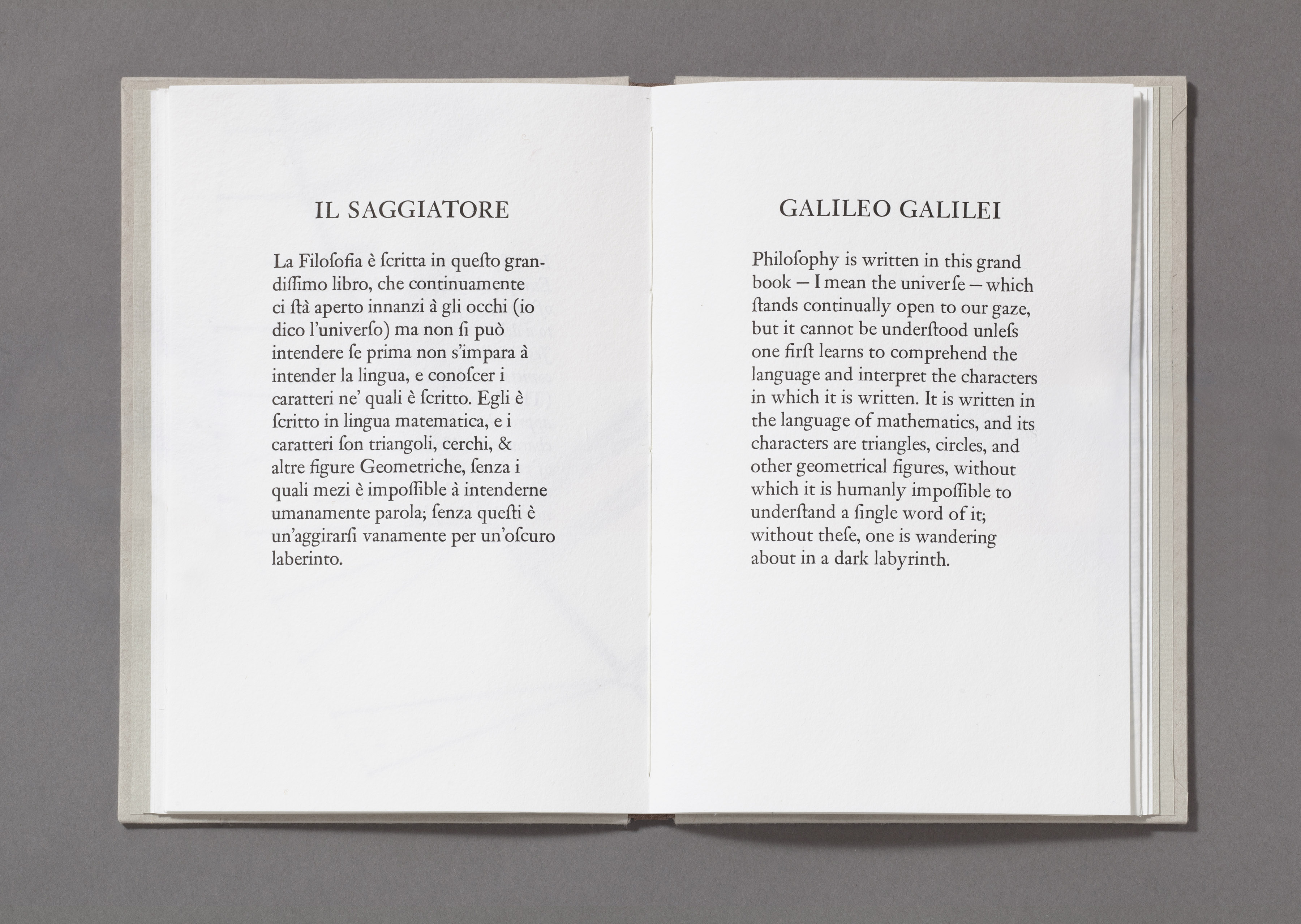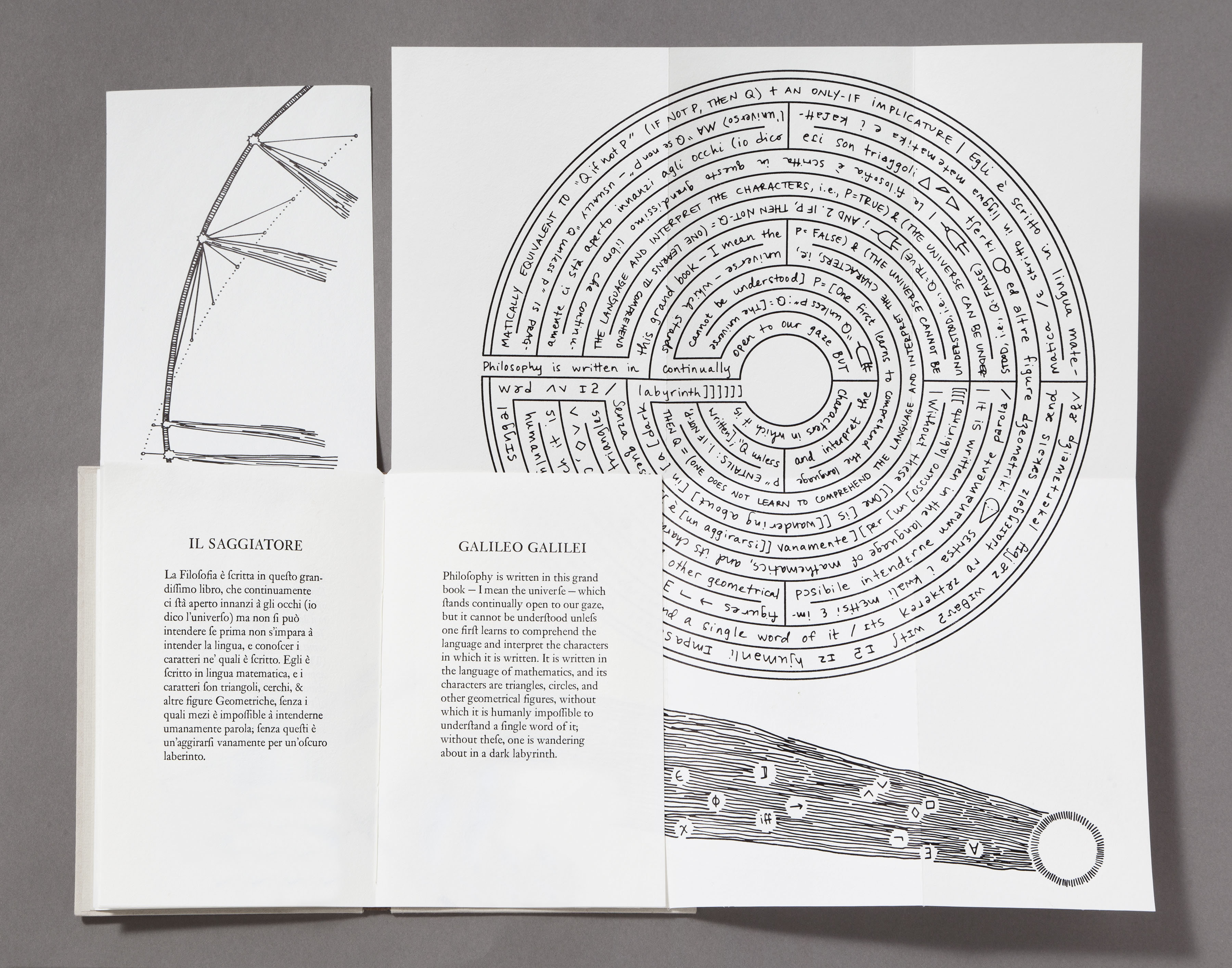 In one of the most important scientific treatises of his era, Galileo compared the act of understanding the universe to reading a book in the language of mathematics. By comprehending the symbols and figures of this “grand book,” one could avoid wandering about in a dark labyrinth of confusion. This artist’s book uses the vehicle of translation—between languages, of text to image, and across domains of language—to illuminate the mathematics and science of linguistics underlying Galileo’s text. Illustrations representing the sounds, syntax, and logic alternate between Italian and English, providing a route through the arguments of the text.
