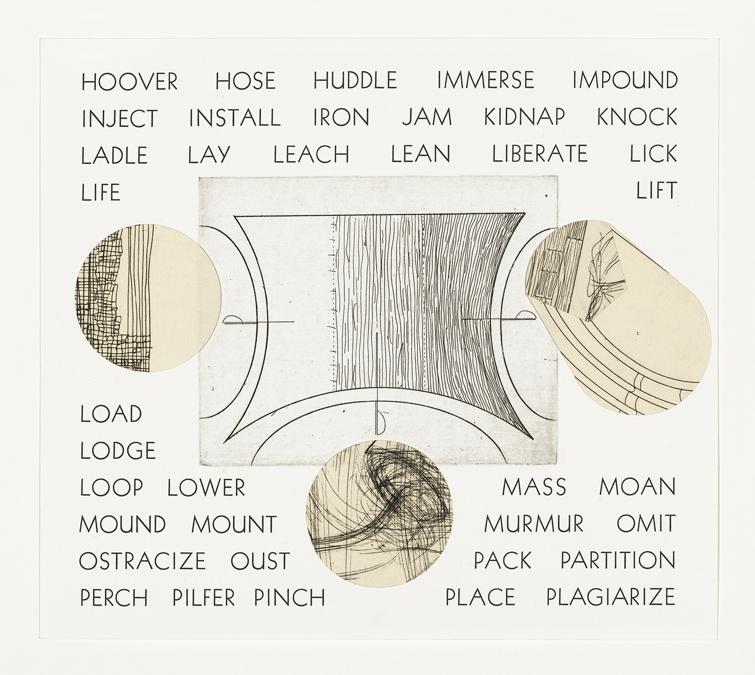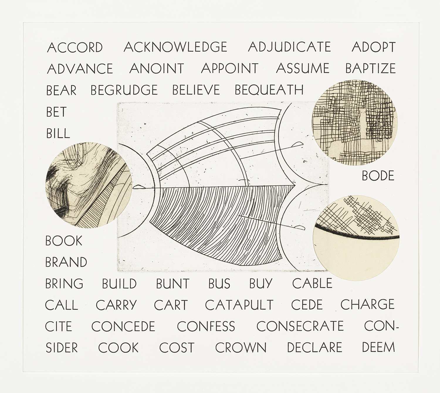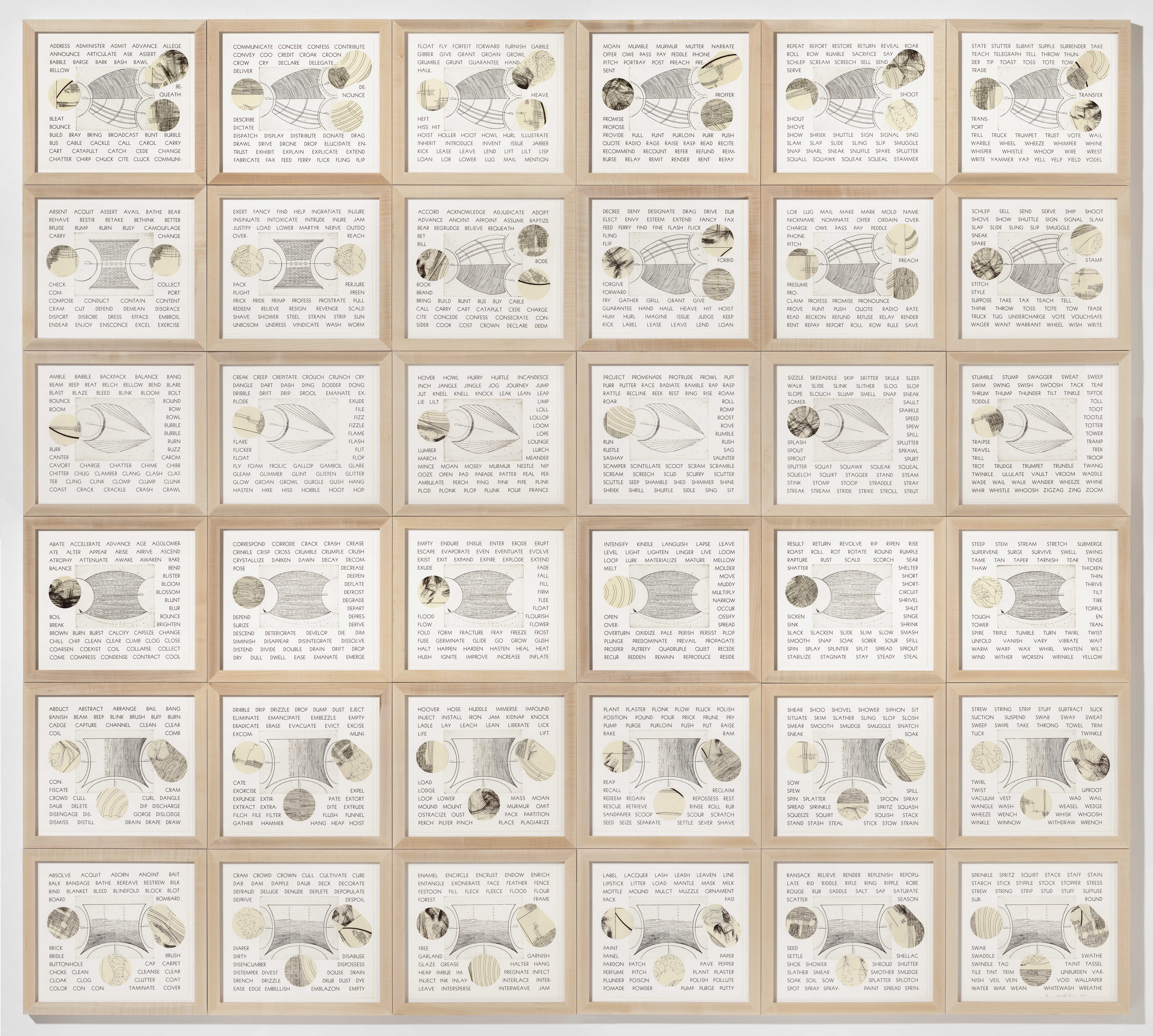 This array of verb-shapes represents only a small part of a rich trove of information that you unknowingly access every time you use language. Repeated shapes, both etched and collaged, combine to form visual representations of a number of classes of English verbs. Running alphabetical lists of words (totaling 1566 in all) are printed across the pages in each row, grouped according to unconsciously known patterns in the meaning and use of vocabulary. Each list belongs to a class of verbs that share structural properties, but that on the surface don’t appear to have much in common. The piece reveals connections across the mental lexicon, while giving shape- and pattern-related hints as to what those connections are. It is left for the viewer to analyze, guess, or marvel at the depth and complexity of our knowledge of language.