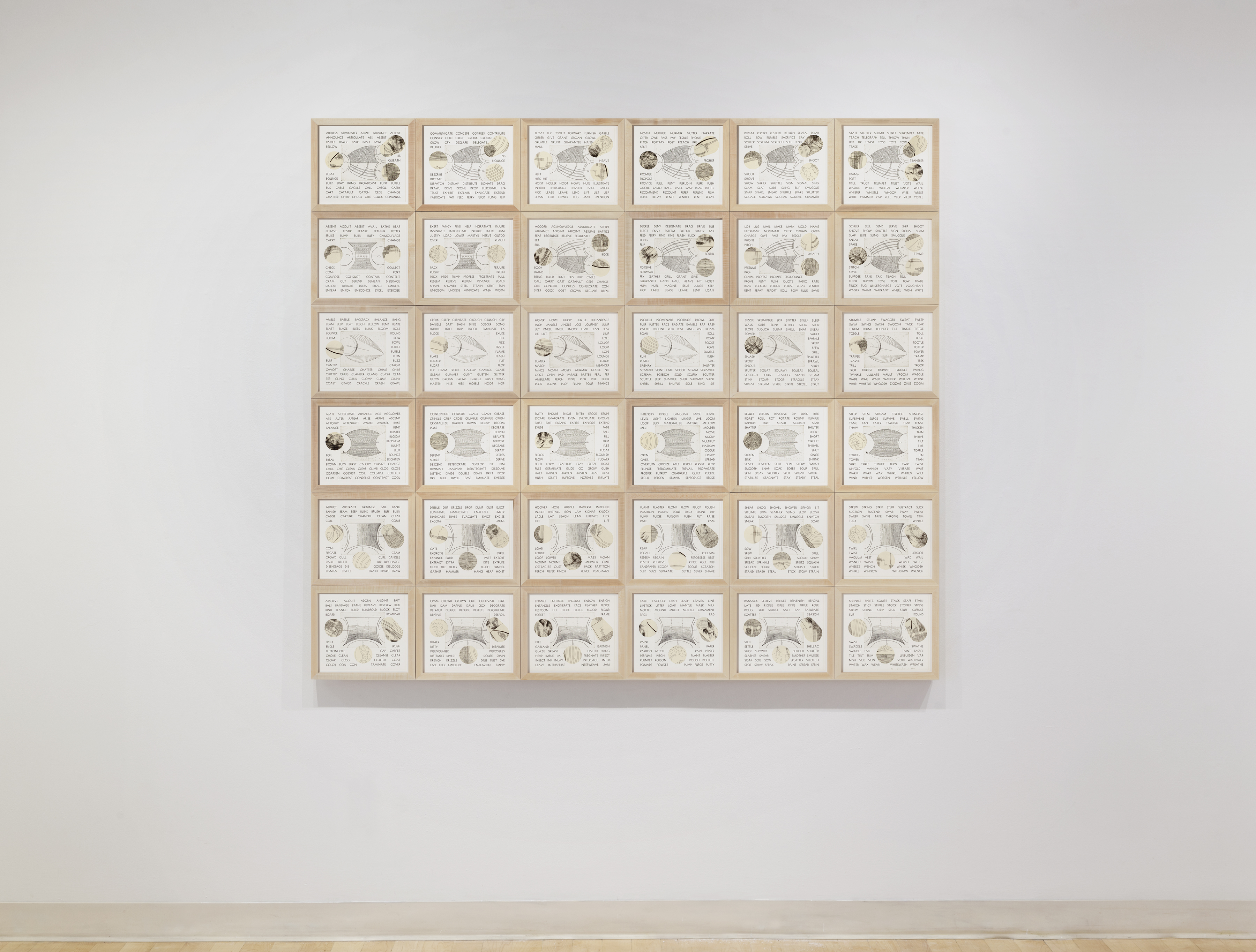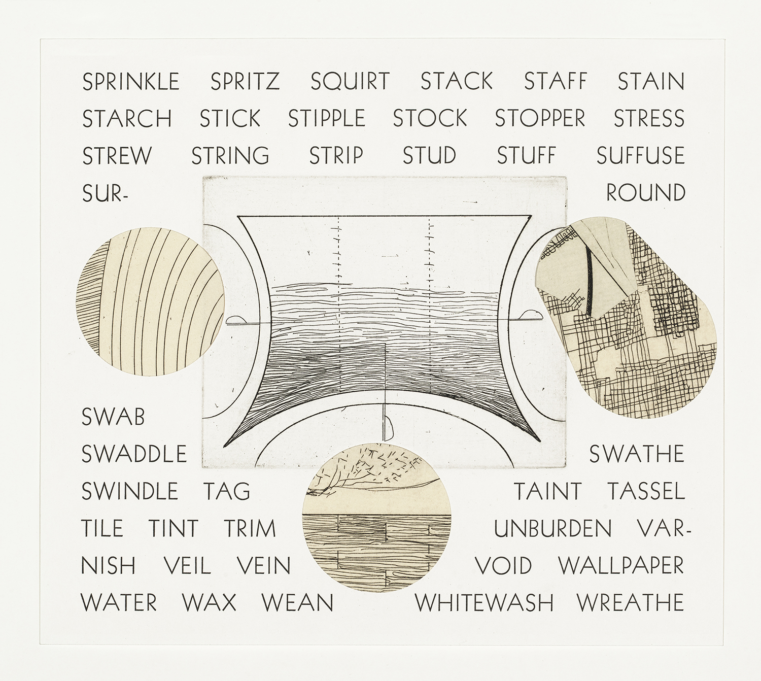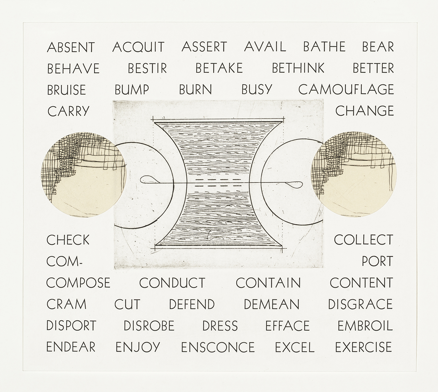 This array of verb-shapes represents only a small part of a rich trove of information that you unknowingly access every time you use language. Repeated shapes, both etched and collaged, combine to form visual representations of a number of classes of English verbs. Running alphabetical lists of words (totaling 1566 in all) are printed across the pages in each row, grouped according to unconsciously known patterns in the meaning and use of vocabulary. Each list belongs to a class of verbs that share structural properties, but that on the surface don’t appear to have much in common. The piece reveals connections across the mental lexicon, while giving shape- and pattern-related hints as to what those connections are. It is left for the viewer to analyze, guess, or marvel at the depth and complexity of our knowledge of language.