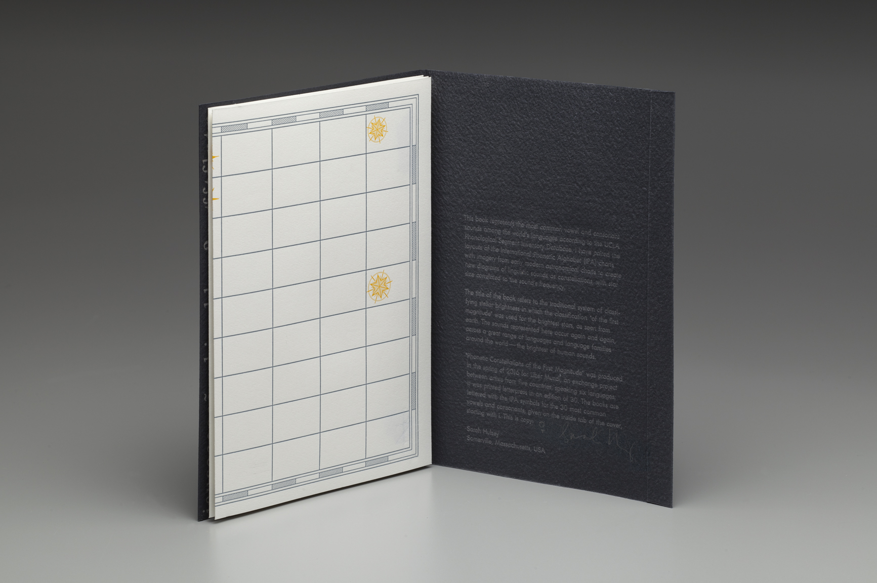 This book represents the most common vowel and consonant sounds among the world’s languages according to the UCLA Phonological Segment Inventory Database. I have paired the layouts of the International Phonetic Alphabet (IPA) charts with imagery from early modern astronomical charts to create new diagrams of linguistic sounds as constellations, with star size correlated to the sound’s frequency. The title of the book refers to the traditional system of classifying stellar brightness in which the classification “of the first magnitude” was used for the brightest stars, as seen from earth. The sounds represented here occur again and again, across a great range of languages and language families around the world–the brightest of human sounds.