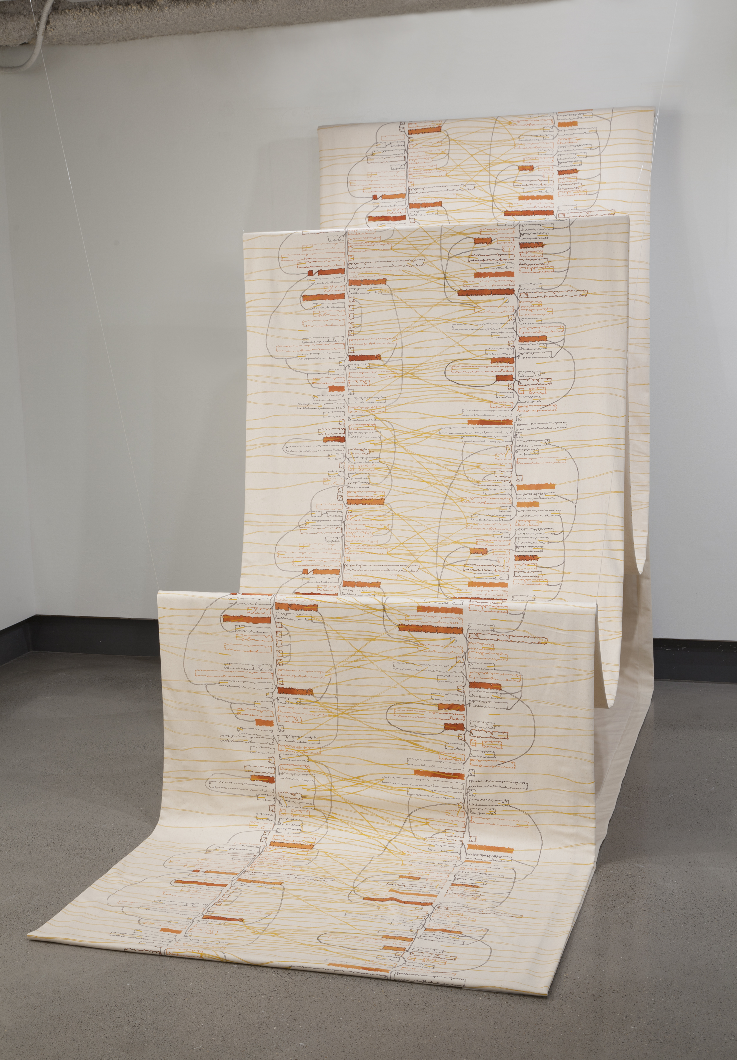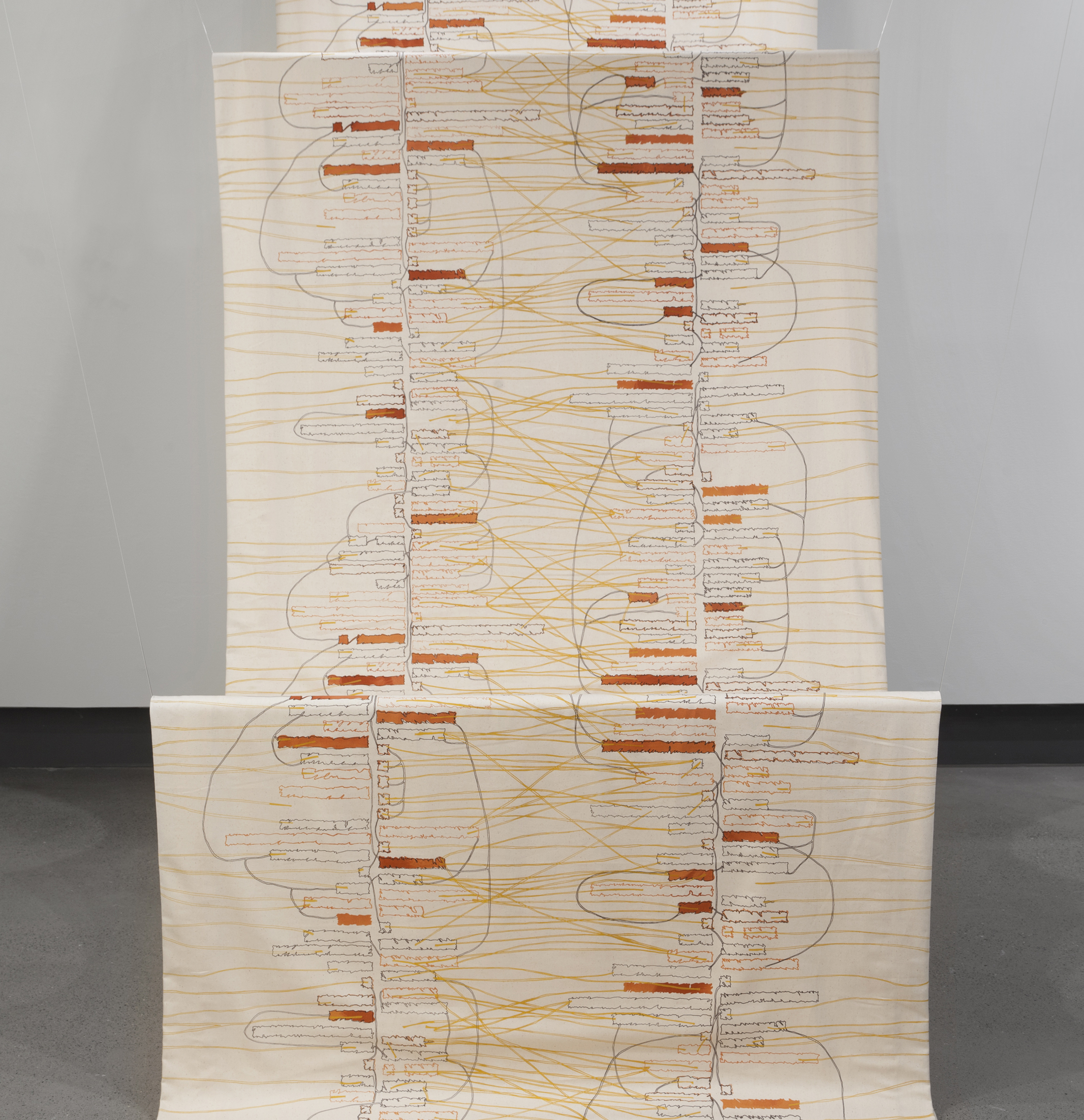 Screenprint on fabric, rods | 45″ x 8′ x 6′ (varies by installation) | 2022